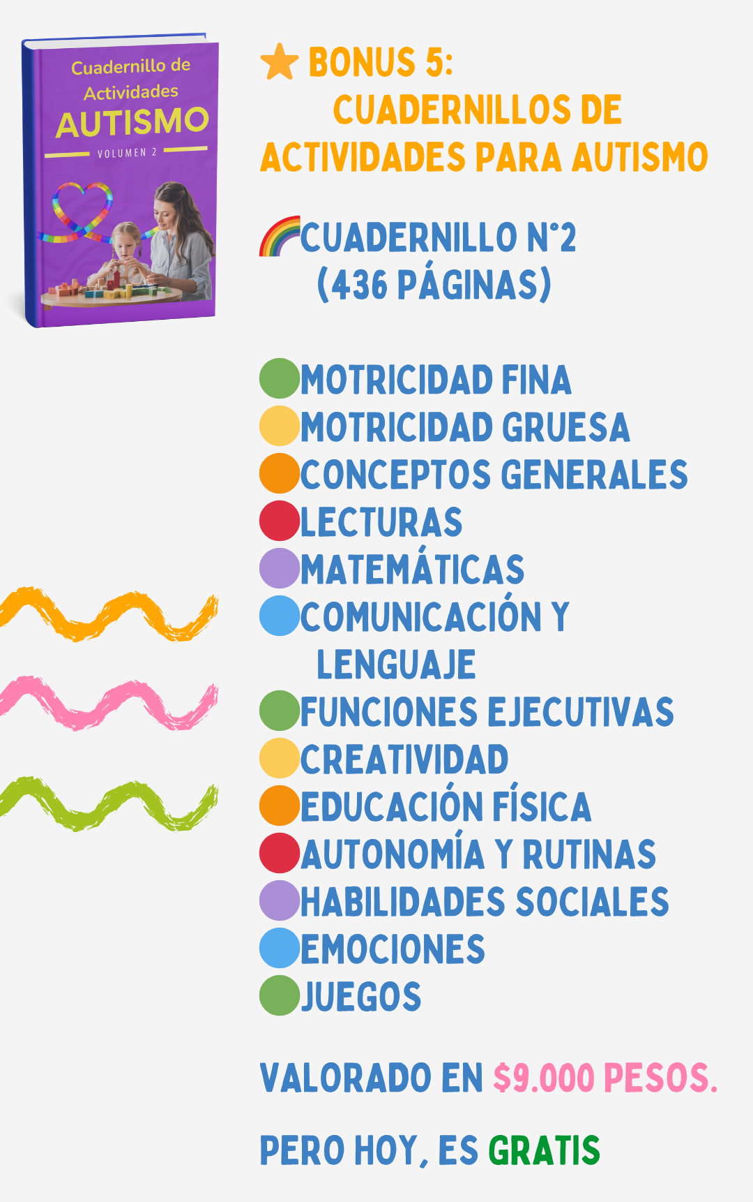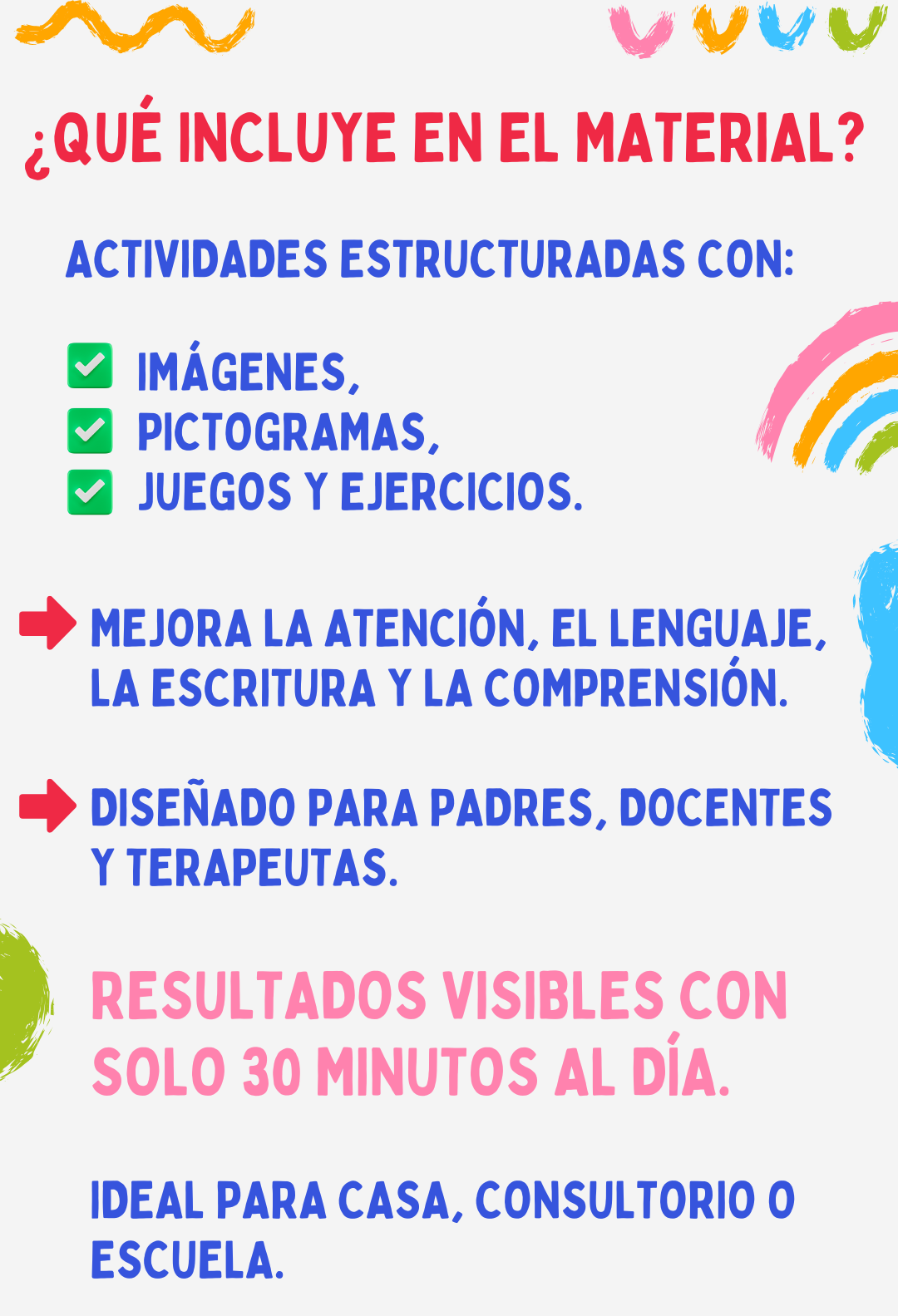 Actividades lúdicas, pictogramas, atención, razonamiento, emociones, lectoescritura, funciones ejecutivas, motricidad y mucho más.
