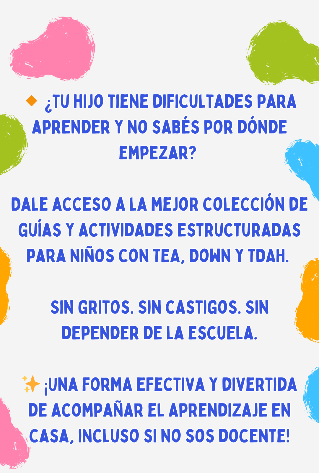 Está pensado para niños de 3 a 10 años con TEA, Down, TDAH o dificultades de aprendizaje, ¡aunque también sirve como refuerzo escolar!