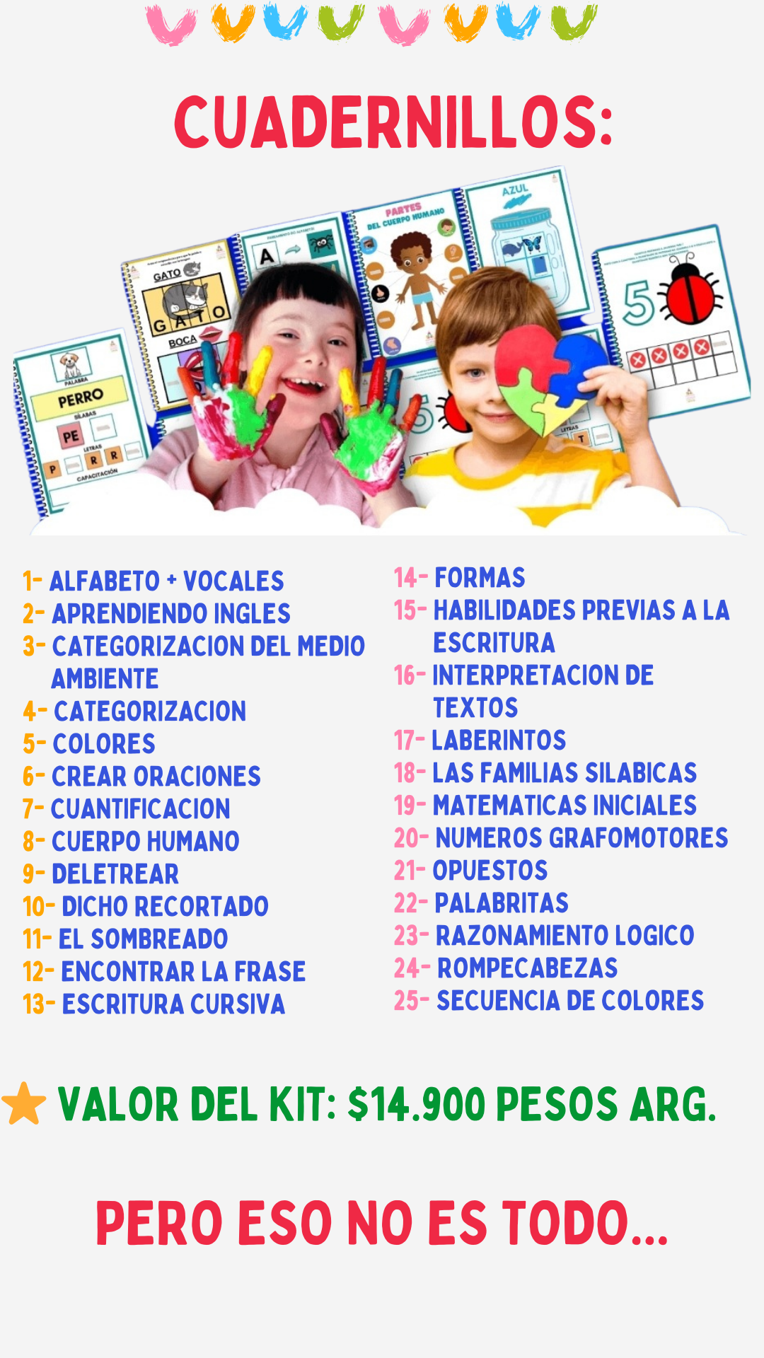Recibís acceso inmediato a los 25 cuadernillos en formato PDF + 5 bonus de regalo. Todo el material es digital y podés descargarlo e imprimirlo cuantas veces quieras.